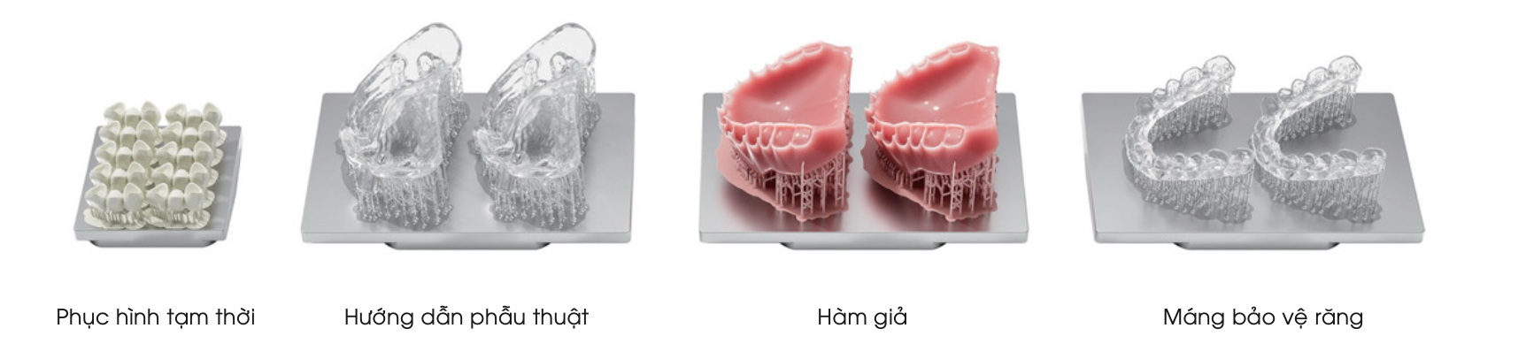 Hướng dẫn phẫu thuật, máng bảo vệ, mô nướu, khay thử, khay cá nhân, hàm giả, mô hình lưu hồ sơ, khay chỉnh nha trong suốt, đúc, phục hình tạm, khay dán gián tiếp.